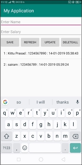 在上面的程式碼中,我們取名稱和薪資作為編輯文字,當用戶點選儲存按鈕時,它會將資料儲存到 SQLite 資料庫中。點選重新整理按鈕以獲取列表檢視。