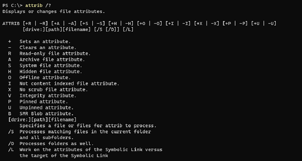 Windows 作業系統支援多種檔案和資料夾屬性。要檢查檔案和資料夾支援哪些屬性,請使用 DOS 命令 attrib /?