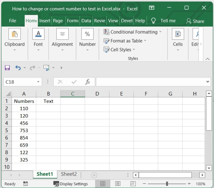 在我們的示例中,我們的Excel工作表中包含數字,如下所示。我們將把這些數字更改為文字。