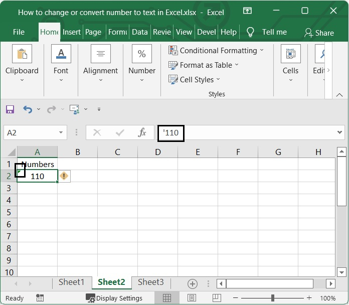 要將數字轉換為文字,請在數字前面加上一個撇號。請參見下圖。
