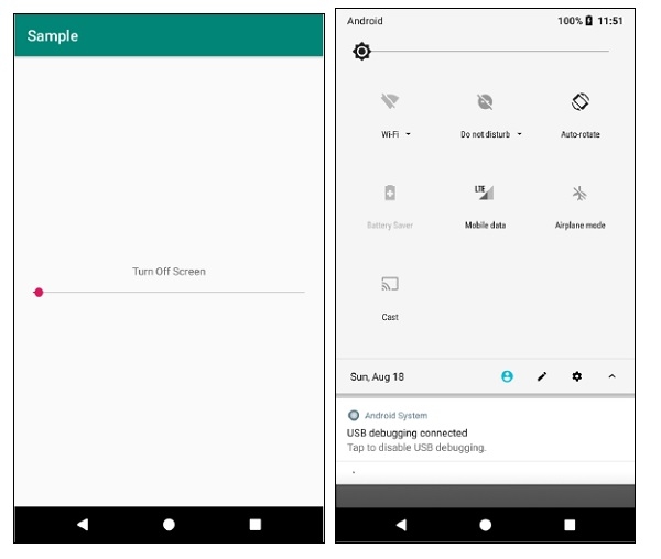 <?xml version="1.0" encoding="utf-8"?> <LinearLayout xmlns:android="http://schemas.android.com/apk/res/android" xmlns:tools="http://schemas.android.com/tools" android:padding="8dp" android:gravity="center" android:orientation="vertical" android:layout_width="match_parent" android:layout_height="match_parent" tools:context=".MainActivity"> <TextView android:id="@+id/textView" android:layout_width="wrap_content" android:layout_height="wrap_content" android:text="Turn Off Screen"/> <SeekBar android:id="@+id/seekBar" android:layout_marginTop="10dp" android:layout_width="match_parent" android:layout_height="wrap_content" /> </LinearLayout>