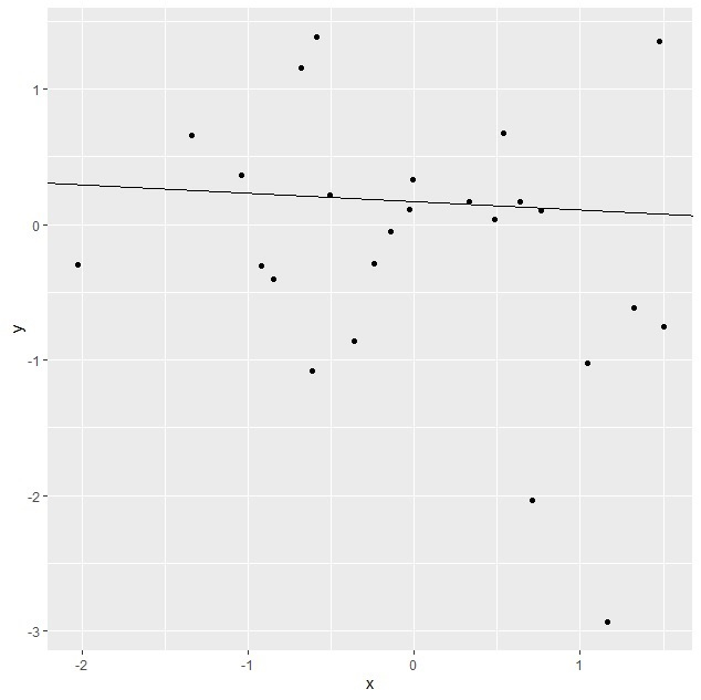 x<-rnorm(25) y<-rnorm(25) df<-data.frame(x,y) library(ggplot2) ggplot(df,aes(x,y))+geom_point()+geom_abline(slope=-0.062712, intercept=0.165886)