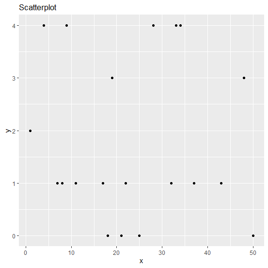 library(ggplot2) ggplot(df,aes(x,y))+geom_point()+labs(title="Scatterplot")