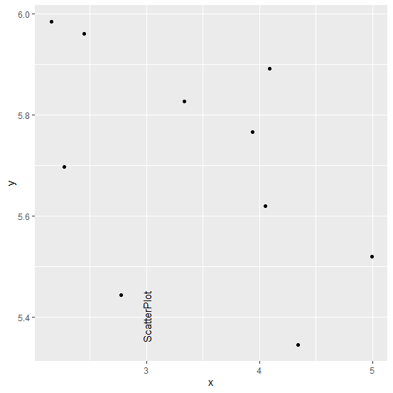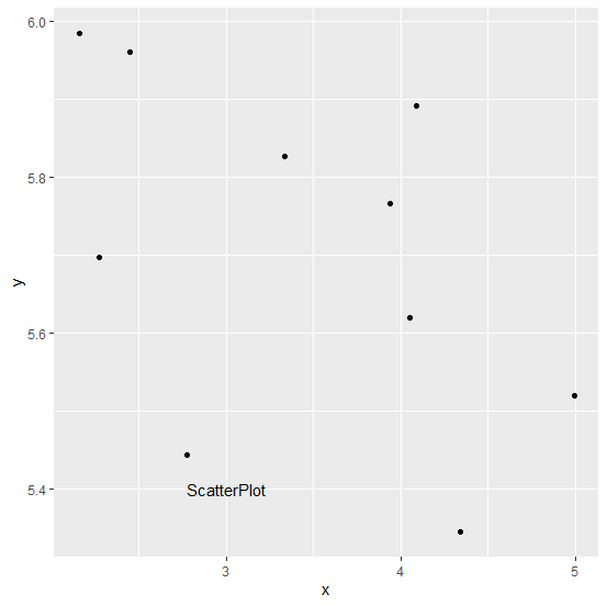 > ggplot(df,aes(x,y))+geom_point()+annotate("text",x=3,y=5.4,label="ScatterPlot")輸出
