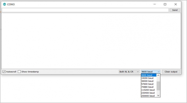 序列監視器開啟後,你可以在底部看到波特率下拉選單,並可從那裡選擇所需的波特率。