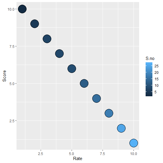 Rate Score S.no 1 1 10 2 2 2 9 5 3 3 8 7 4 4 7 8 5 5 6 9 6 6 5 12 7 7 4 15 8 8 3 18 9 9 2 25 10 10 1 27 > library(ggplot2)