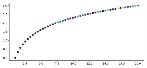 import numpy as np from matplotlib import pyplot as plt plt.rcParams["figure.figsize"] = [7.50, 3.50] plt.rcParams["figure.autolayout"] = True x = np.linspace(1, 20, 50) y = np.log(x) c = np.random.randint(x) plt.scatter(x, y, c=c) plt.show()