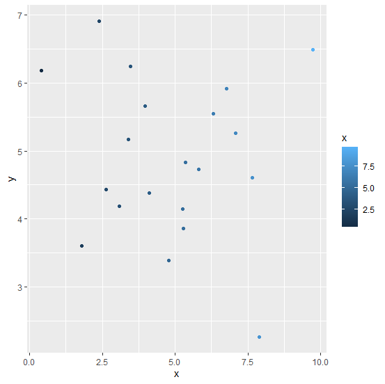 ggplot(df,aes(x,y))+geom_point(aes(colour=x))