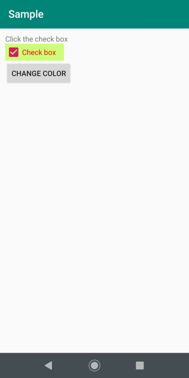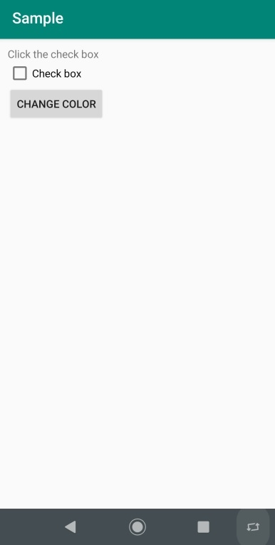 <?xml version="1.0" encoding="utf-8"?> <RelativeLayout xmlns:android="http://schemas.android.com/apk/res/android" xmlns:tools="http://schemas.android.com/tools" android:id="@+id/rl" android:layout_width="match_parent" android:layout_height="match_parent" android:padding="10dp" tools:context=".MainActivity"> <TextView android:id="@+id/tv" android:layout_width="wrap_content" android:layout_height="wrap_content" android:text="Click the check box" /> <CheckBox android:id="@+id/checkbox" android:layout_width="wrap_content" android:layout_height="wrap_content" android:text="Check box" android:layout_below="@id/tv" android:paddingRight="15dp"/> <Button android:id="@+id/button" android:layout_width="wrap_content" android:layout_height="wrap_content" android:text="Change Color" android:layout_below="@id/checkbox" /> </RelativeLayout>