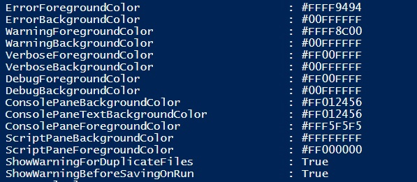 ErrorForegroundColor : #FFFF9494 ErrorBackgroundColor : #00FFFFFF WarningForegroundColor : #FFFF8C00 WarningBackgroundColor : #00FFFFFF VerboseForegroundColor : #FF00FFFF VerboseBackgroundColor : #00FFFFFF DebugForegroundColor : #FF00FFFF DebugBackgroundColor : #00FFFFFF ConsolePaneBackgroundColor : #FF000080 ConsolePaneTextBackgroundColor : #FF012456 ConsolePaneForegroundColor : #FFF5F5F5 ScriptPaneBackgroundColor : #FFFFFFFF ScriptPaneForegroundColor : #FF000000