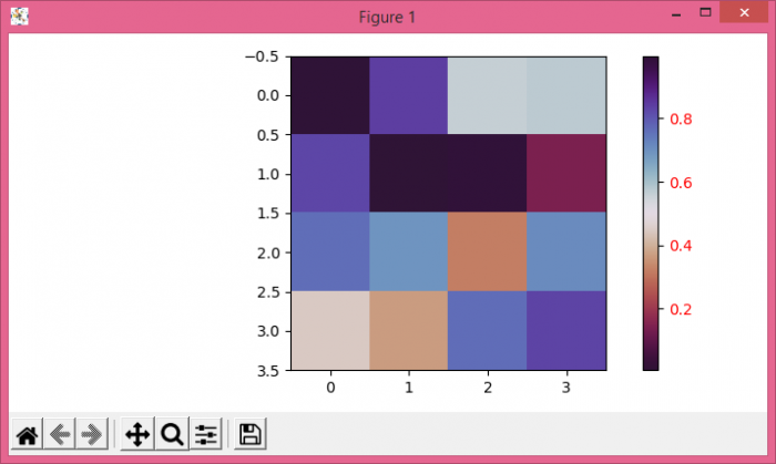 import numpy as np from matplotlib import pyplot as plt plt.rcParams["figure.figsize"] = [7.00, 3.50] plt.rcParams["figure.autolayout"] = True data = np.random.rand(4, 4) im = plt.imshow(data, cmap="twilight_shifted_r") cbar = plt.colorbar(im) cbar_yticks = plt.getp(cbar.ax.axes, 'yticklabels') plt.setp(cbar_yticks, color='r') plt.show()