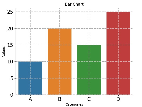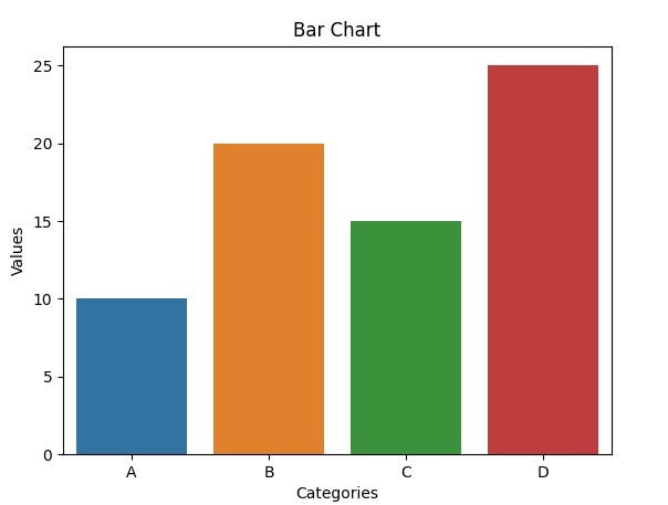 在此示例中,**`sns.barplot()`** 使用 Seaborn 建立條形圖。以下幾行使用 Matplotlib 設定 x 軸標籤、y 軸標籤和標題。最後,**`plt.show()`** 顯示繪圖。