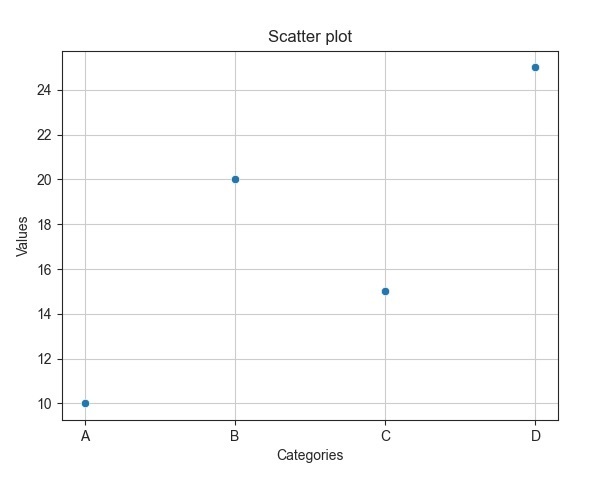 import seaborn as sns import matplotlib.pyplot as plt sns.set_style("whitegrid") # Sample data x = ["A", "B", "C", "D"] y = [10, 20, 15, 25] sns.set_style("ticks") # Create a bar plot sns.scatterplot(x=x, y=y) # Set labels and title Plt.grid = "TRUE" plt.xlabel("Categories") plt.ylabel("Values") plt.title("Scatter plot") plt.show()