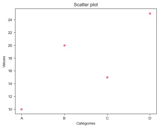 import seaborn as sns import matplotlib.pyplot as plt sns.set_style("ticks") # Sample data x = ["A", "B", "C", "D"] y = [10, 20, 15, 25] # Create a bar plot sns.scatterplot(x=x, y=y) # Set labels and title plt.xlabel("Categories") plt.ylabel("Values") plt.title("Scatter plot") # Display the plot plt.show()