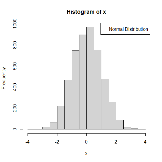 在 R 基本語言中,我們可以使用 legend 函式為繪圖新增圖例。例如,如果我們想要建立一個具有右上角圖例的直方圖,那麼可以使用 legend("topright",legend="Normal Distribution") ,如果我們想要更改字型大小,則需要使用 cex 引數,如下所示