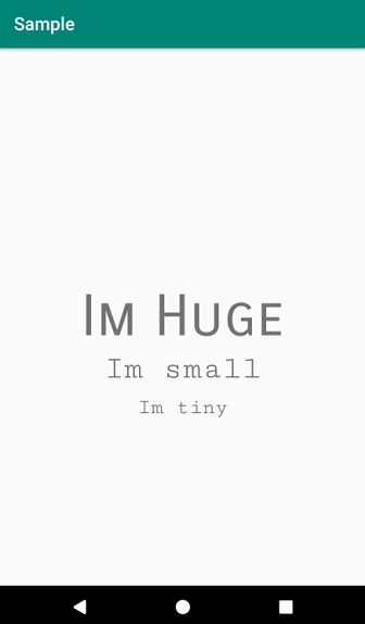 <?xml version="1.0" encoding="utf-8"?> <RelativeLayout xmlns:android="http://schemas.android.com/apk/res/android" xmlns:tools="http://schemas.android.com/tools" android:layout_width="match_parent" android:layout_height="match_parent" tools:context=".MainActivity"> <TextView android:id="@+id/textView1" android:layout_width="wrap_content" android:layout_height="wrap_content" android:text="Im Huge" android:fontFamily="sans-serif-smallcaps" android:layout_centerInParent="true" android:textSize="64sp" /> <TextView android:id="@+id/textView2" android:layout_width="wrap_content" android:layout_height="wrap_content" android:layout_below="@id/textView1" android:layout_marginBottom="10dp" android:text="Im small" android:layout_centerInParent="true" android:fontFamily="serif-monospace" android:textSize="36sp" /> <TextView android:id="@+id/textView3" android:layout_width="wrap_content" android:layout_height="wrap_content" android:layout_below="@id/textView2" android:layout_marginBottom="10dp" android:text="Im tiny" android:layout_centerInParent="true" android:fontFamily="serif-monospace" android:textSize="24sp" /> </RelativeLayout>