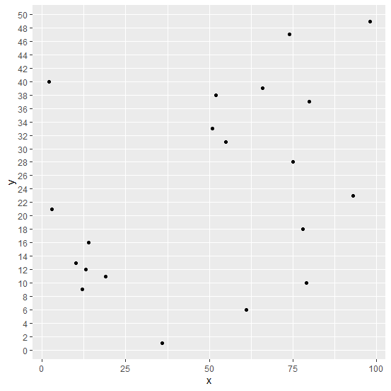 > ggplot(df,aes(x,y))+geom_point()+scale_y_continuous(minor_breaks=seq(0,50,2),breaks =seq(0,50,2))
