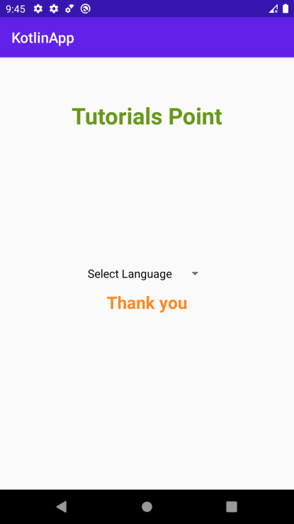 <?xml version="1.0" encoding="utf-8"?> <RelativeLayout xmlns:android="http://schemas.android.com/apk/res/android" xmlns:tools="http://schemas.android.com/tools" android:id="@+id/rl" android:layout_width="match_parent" android:layout_height="match_parent" android:padding="10dp" tools:context=".MainActivity"> <TextView android:layout_width="wrap_content" android:layout_height="wrap_content" android:layout_centerHorizontal="true" android:layout_marginTop="50dp" android:text="Tutorials Point" android:textAlignment="center" android:textColor="@android:color/holo_green_dark" android:textSize="32sp" android:textStyle="bold" /> <Spinner android:id="@+id/spinner" android:layout_width="wrap_content" android:layout_height="wrap_content" android:layout_centerInParent="true" /> <TextView android:id="@+id/string" android:layout_width="wrap_content" android:layout_height="wrap_content" android:layout_below="@id/spinner" android:layout_centerInParent="true" android:text="@string/thank_you" android:textColor="@android:color/holo_orange_dark" android:textSize="24sp" android:textStyle="bold" /> </RelativeLayout>
