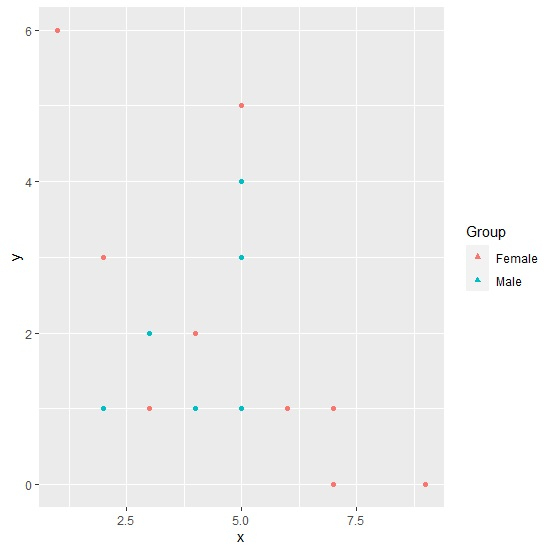 x y Group 1 7 1 Female 2 7 0 Female 3 4 2 Male 4 3 2 Male 5 2 1 Male 6 9 0 Female 7 5 4 Male 8 3 1 Female 9 5 1 Female 10 6 1 Female 11 3 2 Male 12 5 1 Male 13 4 1 Male 14 5 3 Female 15 1 6 Female 16 5 3 Male 17 4 2 Female 18 5 5 Female 19 2 3 Female 20 5 4 Male