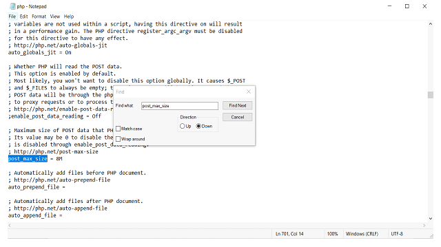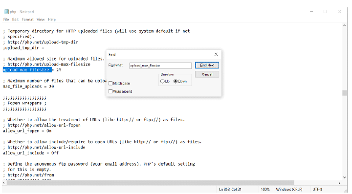 在編輯器模式(如記事本或寫字板)中開啟php.ini檔案,並搜尋upload_max_filesize指令。此指令確定單個上傳檔案的最大大小。預設情況下,它通常設定為相對較低的值,例如“2M”(2 兆位元組)。