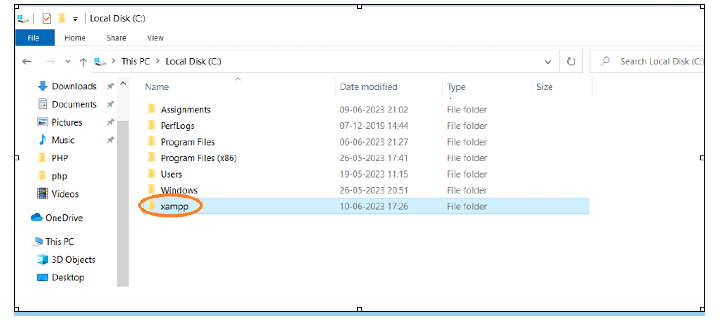 以管理員許可權開啟 C 盤,然後開啟 xampp 資料夾。