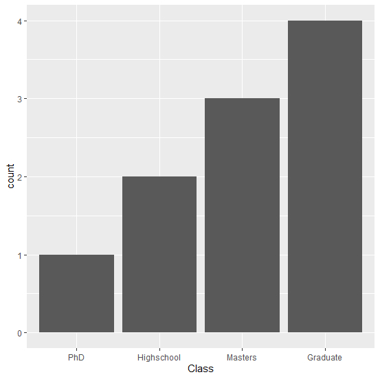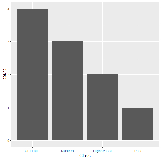 > data <- data.frame(Class=c("Highschool","Highschool","Graduate","Graduate", "Graduate","Graduate","Masters","Masters","Masters","PhD"))