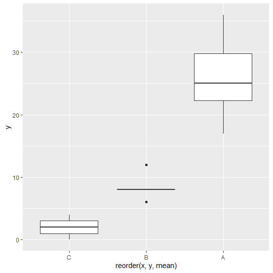 > ggplot(df,aes(x=reorder(x,y,mean),y))+geom_boxplot()