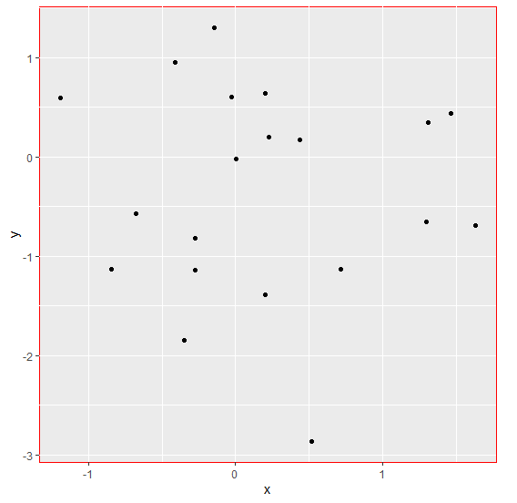 x<-rnorm(20) y<-rnorm(20) df<-data.frame(x,y) library(ggplot2) ggplot(df,aes(x,y))+geom_point()+theme(panel.background=element_rect(colour="red"))