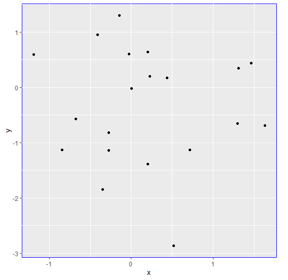x<-rnorm(20) y<-rnorm(20) df<-data.frame(x,y) library(ggplot2) ggplot(df,aes(x,y))+geom_point()+theme(panel.background=element_rect(colour="blue"))