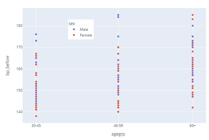import plotly.express as px import pandas as pd data = pd.read_csv("https://raw.githubusercontent.com/Opensourcefordatascience/Data-sets/master/blood_pressure.csv") fig = px.scatter(data, x="agegrp", y="bp_before", color="sex") fig.update_layout(legend=dict(yanchor="top", y=0.9, xanchor="right", x=0.4)) fig.show()