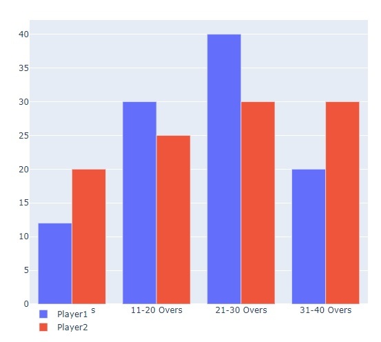 import plotly.graph_objects as px import pandas as pd x = ['1-10 Overs', '11-20 Overs', '21-30 Overs', '31-40 Overs'] plot = px.Figure(data=[px.Bar( name = 'Player1', x = x, y = [12,30,40,20] ),px.Bar( name = 'Player2', x = x, y = [20,25,30,30] ) ]) plot.update_layout(legend = dict(yanchor="top", y=0, xanchor="left", x=0)) plot.show()
