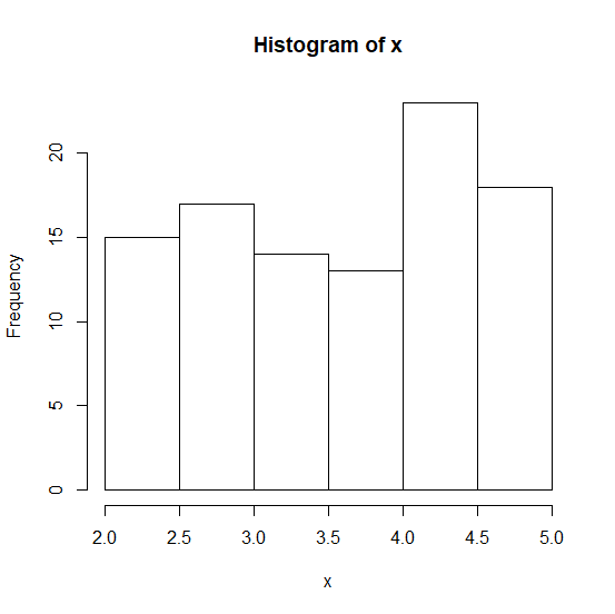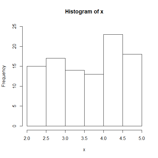 set.seed(101) x<-runif(100,2,5) hist(x)