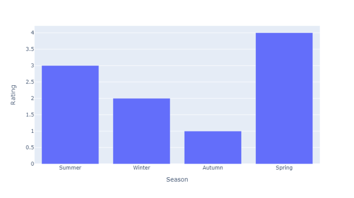 # import pandas module import pandas as pd df_bar = pd.DataFrame({ "Season": ["Summer", "Winter", "Autumn", "Spring"], "Rating": [3,2,1,4] })