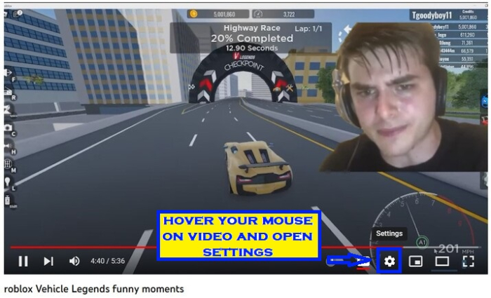 將滑鼠懸停在影片螢幕上。螢幕上會出現一些圖示。點選影片螢幕上的設定圖示(就像齒輪箱一樣)。