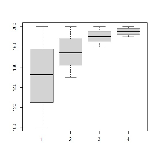 Class1<-sample(101:200,1000,replace=TRUE) Class2<-sample(150:200,1000,replace=TRUE) Class3<-sample(180:200,1000,replace=TRUE) Class4<-sample(190:200,1000,replace=TRUE) boxplot(Class1,Class2,Class3,Class4)