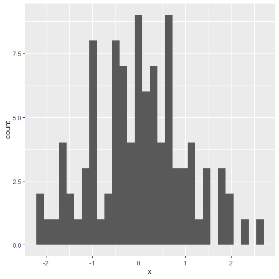 library(ggplot2) ggplot(df,aes(x))+geom_histogram(bins=30)