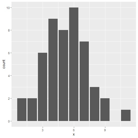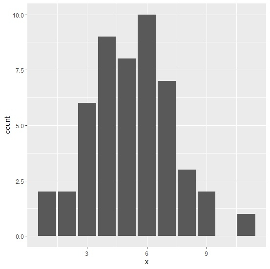 > ggplot(df,aes(x))+ + geom_bar()+ + scale_y_continuous(breaks=c(0,2,4,6,8,10))