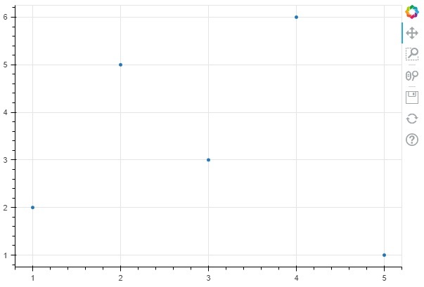 from bokeh.plotting import figure, show p = figure(width=600, height=400) x = [1, 2, 3, 4, 5] y = [2, 5, 3, 6, 1] p.scatter(x, y) show(p)