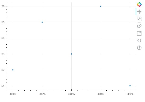 from bokeh.plotting import figure, show from bokeh.models import NumeralTickFormatter p = figure(width=600, height=400) x = [1, 2, 3, 4, 5] y = [2, 5, 3, 6, 1] p.scatter(x, y) p.yaxis.formatter = NumeralTickFormatter(format="$0,0") p.xaxis.formatter = NumeralTickFormatter(format = "%0,0") show(p)