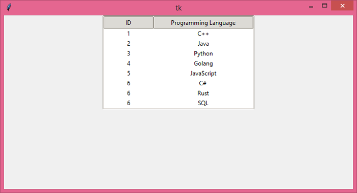 在此示例中,我們建立了一個包含程式語言列表的表格。列“ID”和“程式語言”的寬度設定為其內容。此外,我們可以賦予一個值來設定列的寬度。