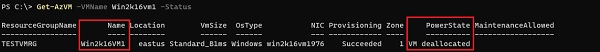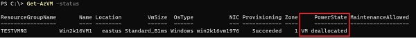 要檢查 VM 正在執行、已釋放還是已停止,可以使用 PowerShell 中的 **-Status** 引數。