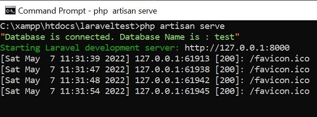 C:\xampp\htdocs\laraveltest>php artisan testdbconnection "Database is connected. Database Name is : test" C:\xampp\htdocs\laraveltest>