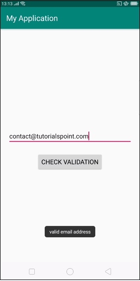 <?xml version = "1.0" encoding = "utf-8"?> <LinearLayout xmlns:android = "http://schemas.android.com/apk/res/android" android:id = "@+id/parent" xmlns:tools = "http://schemas.android.com/tools" android:layout_width = "match_parent" android:layout_height = "match_parent" tools:context = ".MainActivity" android:gravity = "center" android:orientation = "vertical"> <EditText android:id = "@+id/emailId" android:hint = "Enter Email id" android:layout_margin = "20dp" android:layout_width = "match_parent" android:layout_height = "wrap_content" /> <Button android:id = "@+id/text" android:textSize = "18sp" android:textAlignment = "center" android:layout_width = "wrap_content" android:textColor = "#000" android:text = "Check validation" android:layout_height = "wrap_content" /> </LinearLayout>