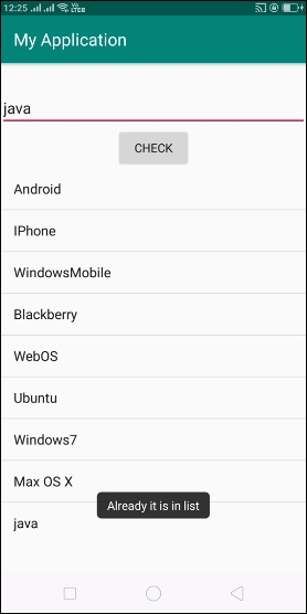 在上面的結果中,我們已將 元素 新增到 ListView中,現在輸入 相同 的值以進行資料驗證,如下所示 -