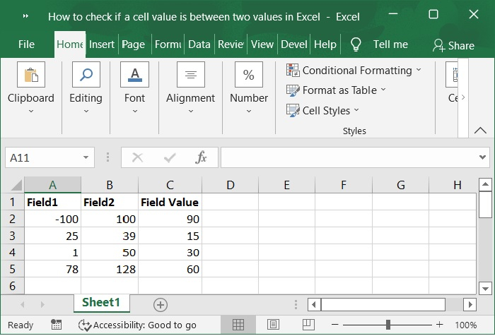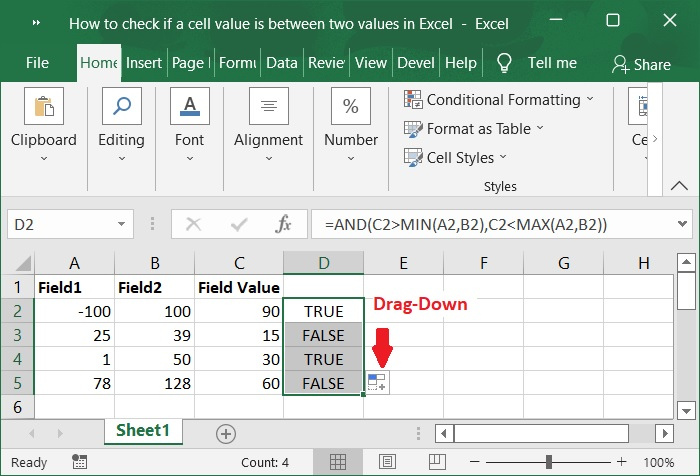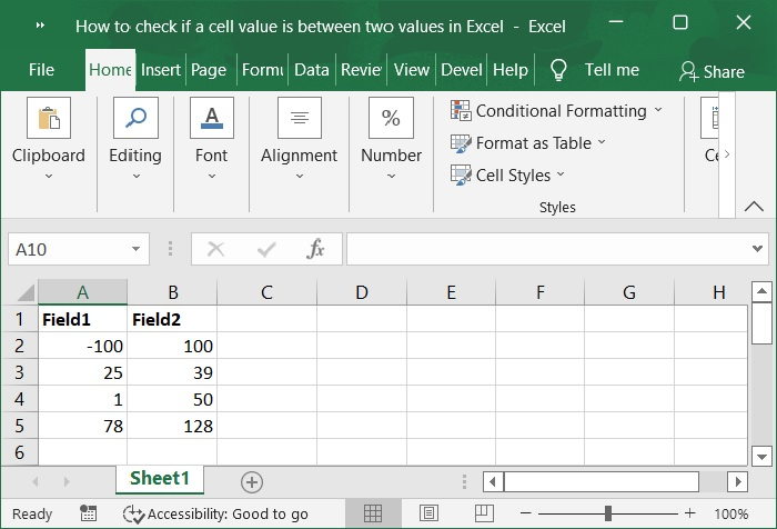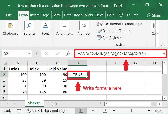 需要檢查的兩個條件如下:該值必須大於較小的數字,並且它還必須小於較大的數字。為了實現這一點,我們將利用 Excel 的 MIN 和 MAX 函式。