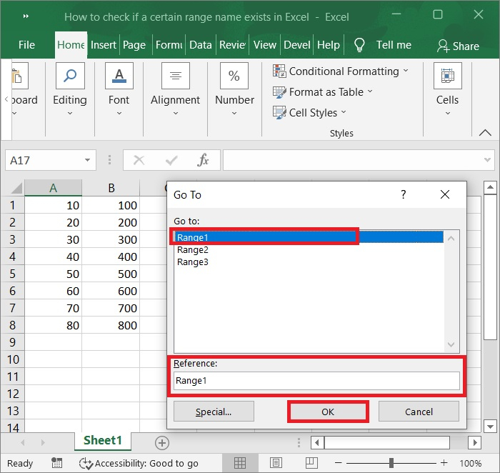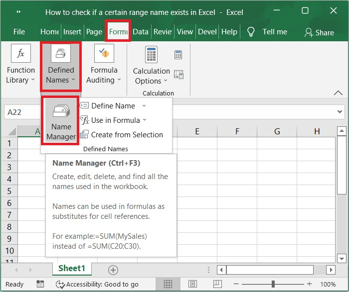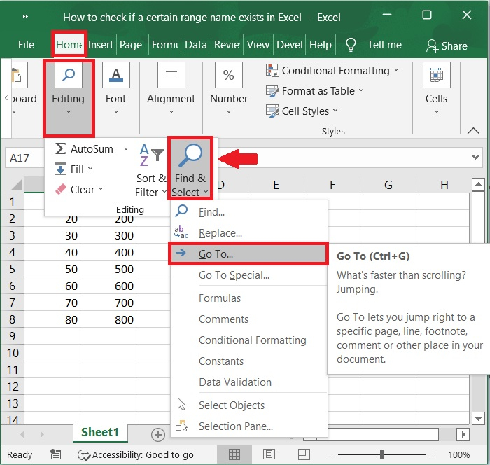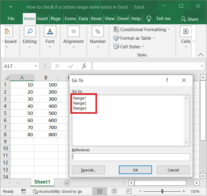 首先,讓我們看看如何在 Excel 中使用“轉到”選項來檢查區域名稱是否存在。