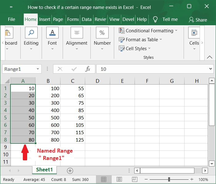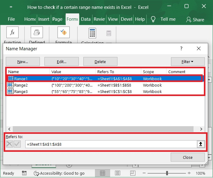 在下面的螢幕截圖中,我們可以檢查命名區域“Range1”是否已突出顯示。