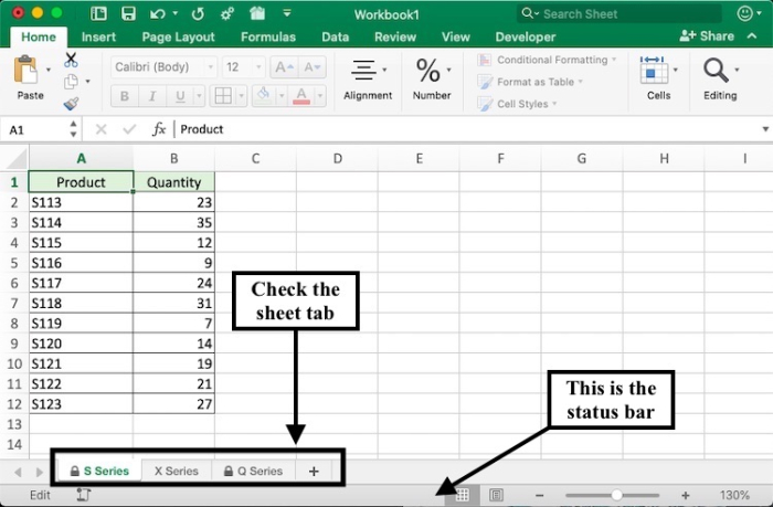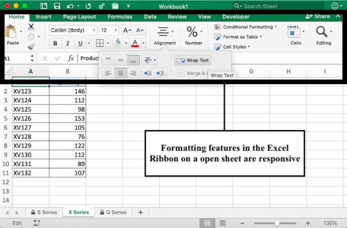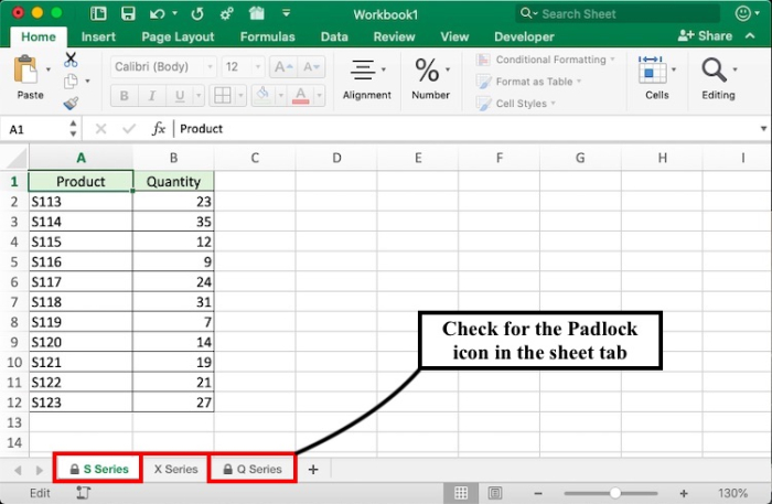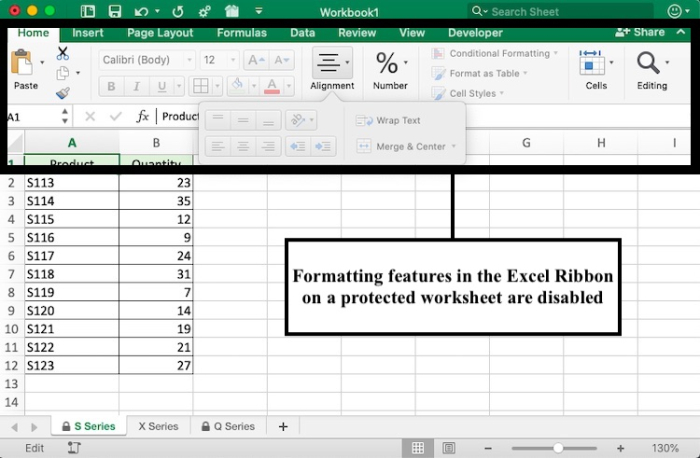 受保護的工作表無法刪除或修改。當工作表受保護時,Excel會自動停用格式按鈕,單元格將變為只讀。我們將透過對比標記為“X系列”的未保護工作表和標記為“S系列”的受保護工作表的MS Excel功能區來展示這一點。