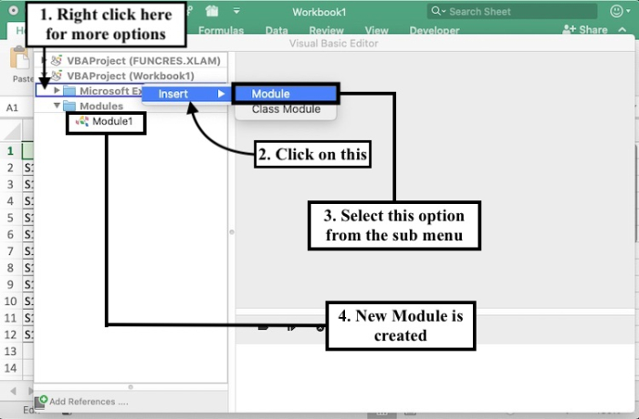 步驟2 - 右鍵單擊“Microsoft Excel物件”,然後從下拉選單中選擇“插入”→“模組”。