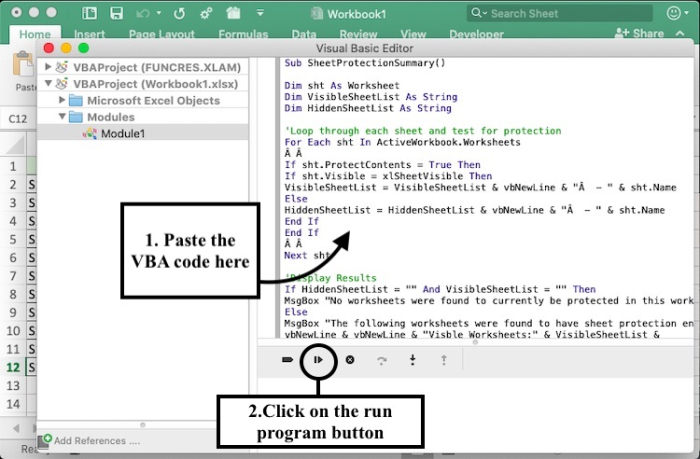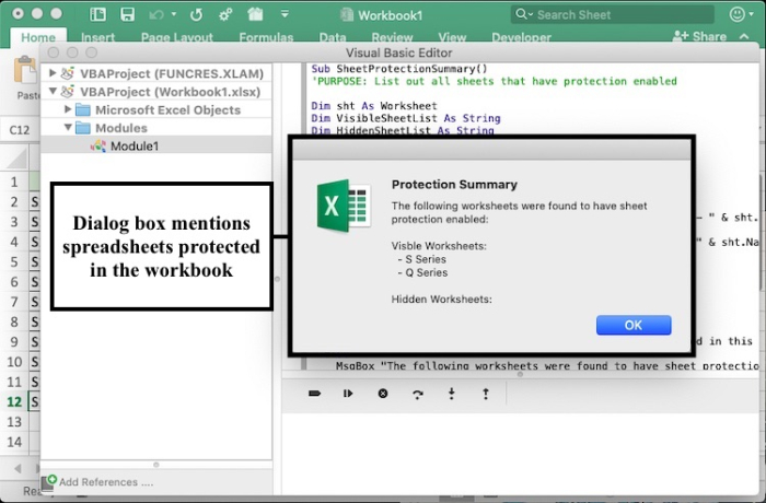單擊執行程式按鈕以檢視VBA程式碼的結果。將出現一個對話方塊,顯示工作簿中受保護的工作表。